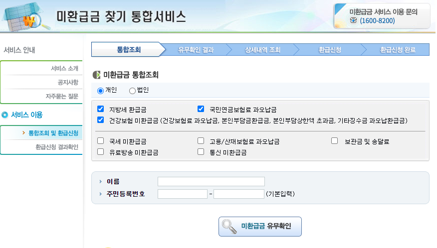 여태까지 냈었던 각종 세금들 중에서 미환급금들이 있어요. 이 미환급금들을 조회하고 환급받으실 수 있습니다. 네이버에서 "미환급금 찾기 통합서비스" 라고 검색합니다.