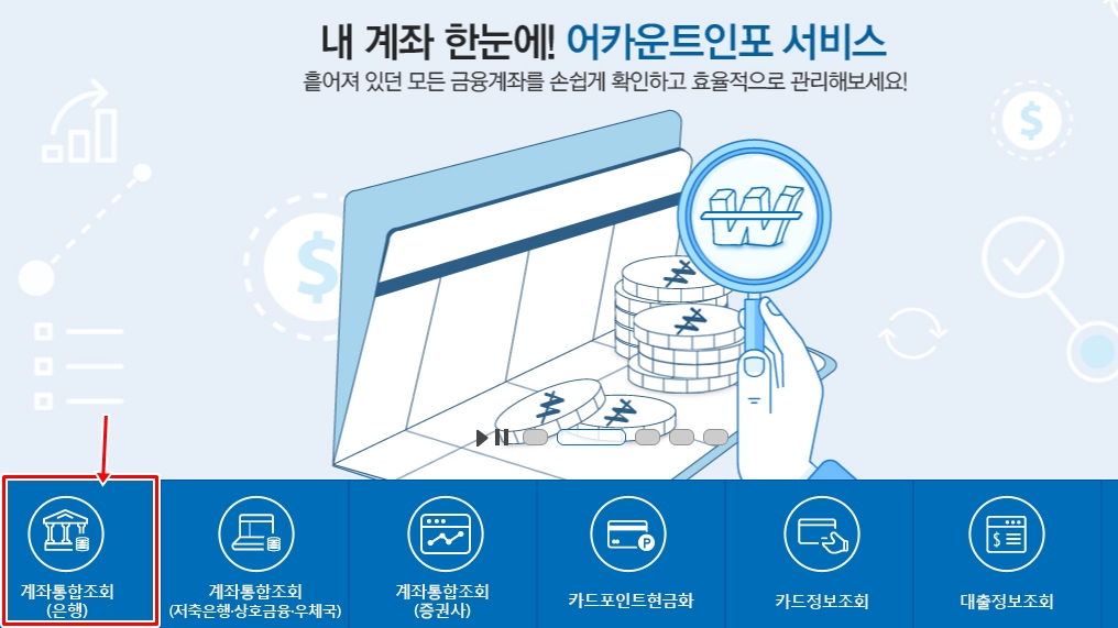 계좌정보통합관리서비스 사이트가 뭐하는 곳이나면 여러분이 태어나서 지금까지 가입하셨던 모든 통장들을 한번에 확인하실 수 있는 사이트 입니다. 어렸을때 나도 모르게 만들었던 통장, 왜 있는지도 모르는 통장들이 모두 다 있습니다. 중요한건 이통장들에 나도 모르는 사이에 돈이 잠들어 있다는 겁니다. 이홈페이지에 들어간 뒤 윈쪽 하단에 있는 "계좌통합조회"를 클릭하세요.