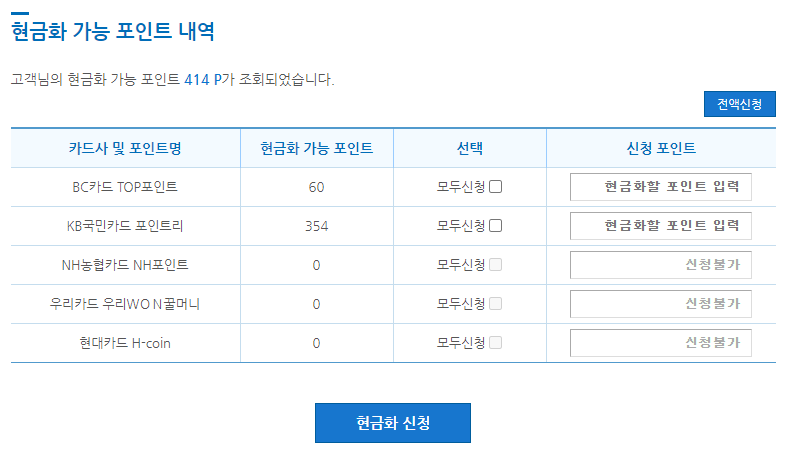 간단한 본인인증을 거치면 여러분이 사용하고 있는 카드사의 포인트가 전부 나옵니다. 현금화 하기위해서는 현금화할 포인트 입력하시고 전액신청 하시면 포인트가 여러분 통장으로 들어 갑니다.