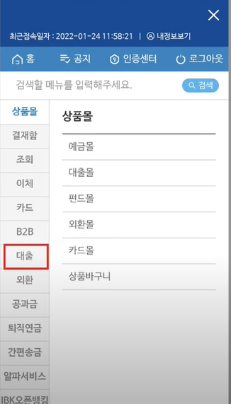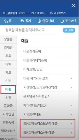 대출을 선택하면 고신용자와 중신용자에 따라 메뉴를 다르게 선택 하셔야 합니다.