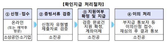 온라인 등을 통해 신청 접수 후 기본정보․증빙자료구비여부, 지원요건 충족 여부 확인을 거쳐 지급 하며 증빙서류를 온라인으로 제출 후 소상공인시장진흥공단(이하 “소진공”)에서 확인 · 검증을 거쳐 지급 ( 서류가 미흡하거나 허위사실 확인 및 미제출 시에는 부지급 처리 됩니다.)