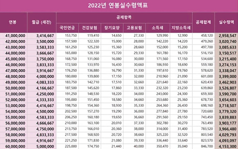 연봉실수령액표를 통해 2022 연봉실수령액을 확인해 보도록 하겠습니다.