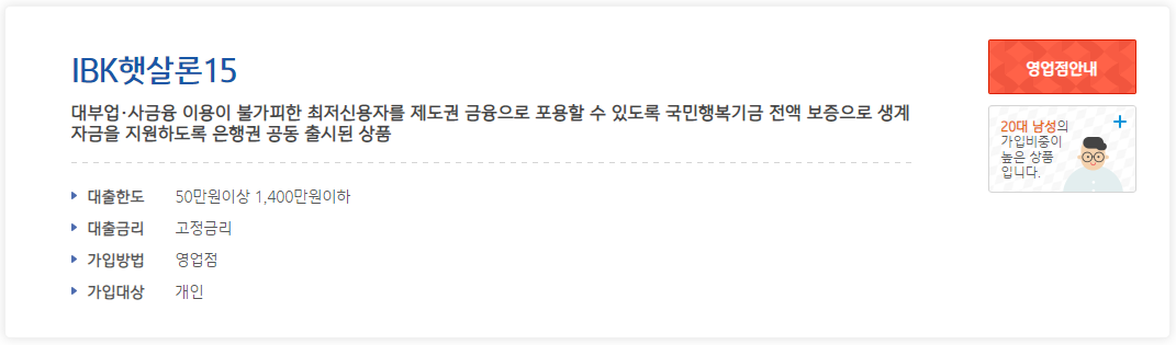 IBK햇살론15는 대부업·사금융 이용이 불가피한 최저 신용자를 제도권 금융으로 포용할 수 있도록 국민행복기금 전액 보증으로 생계자금을 지원하도록 은행권 공동 출시된 상품입니다.